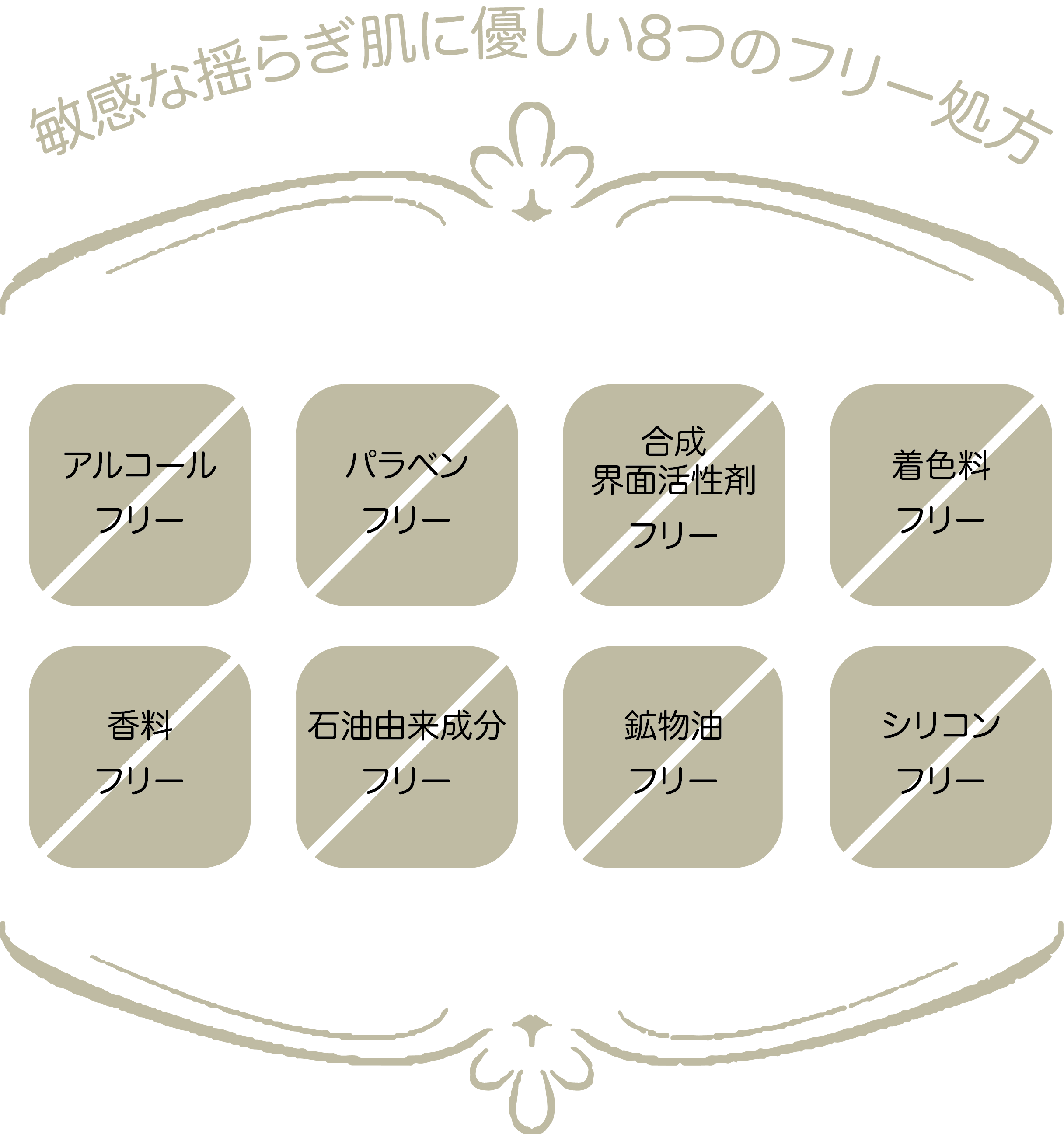アルコールフリー/パラペンフリー/鉱物油フリー/石油系合成界面活性剤フリー/着色料フリー/香料フリー/シリコンフリー/紫外線吸収剤フリー