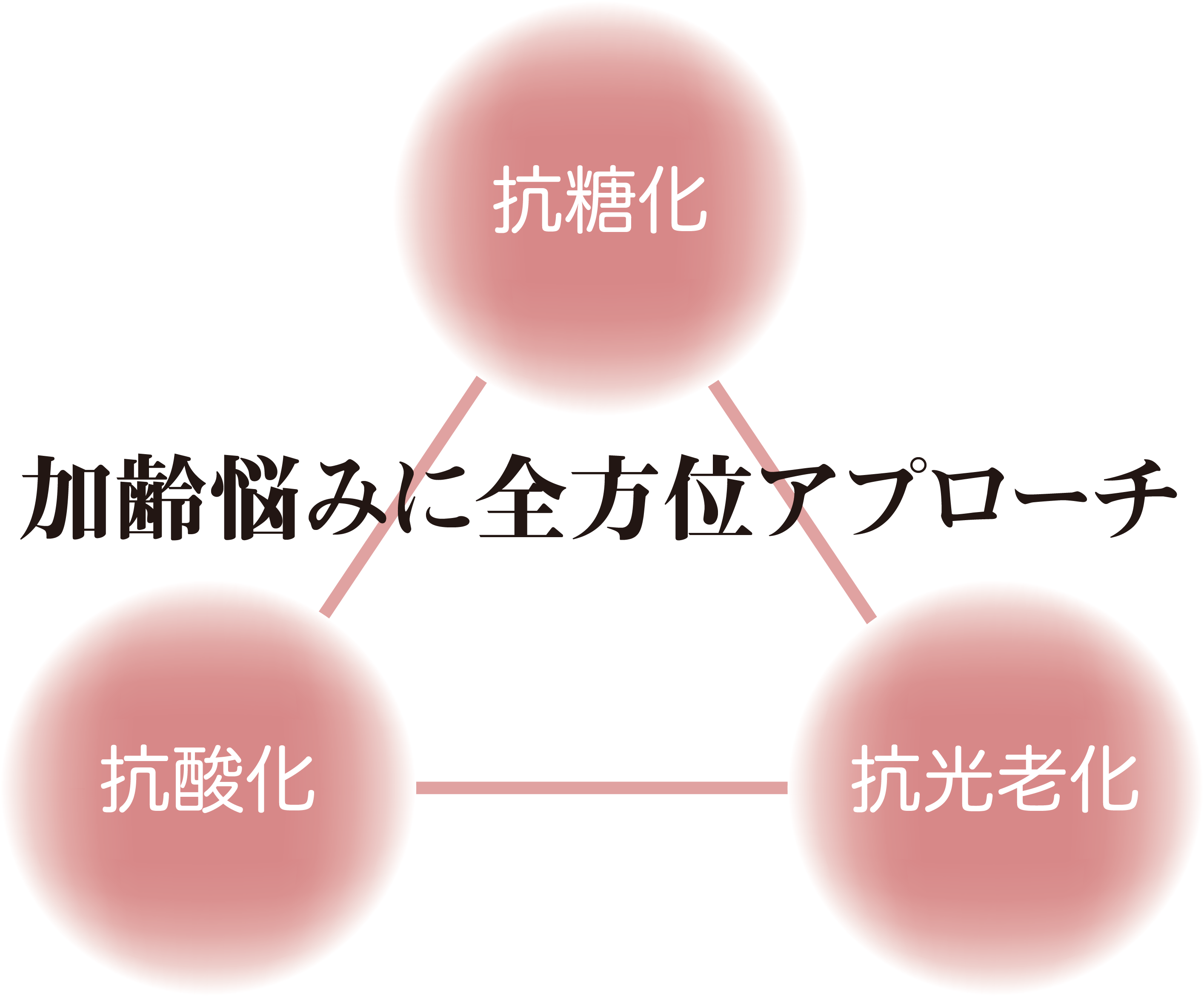 老け見えの3大要因である糖化・酸化・光老化に全方位アプローチで、ハリと潤いに満ちた艶輝肌へ。